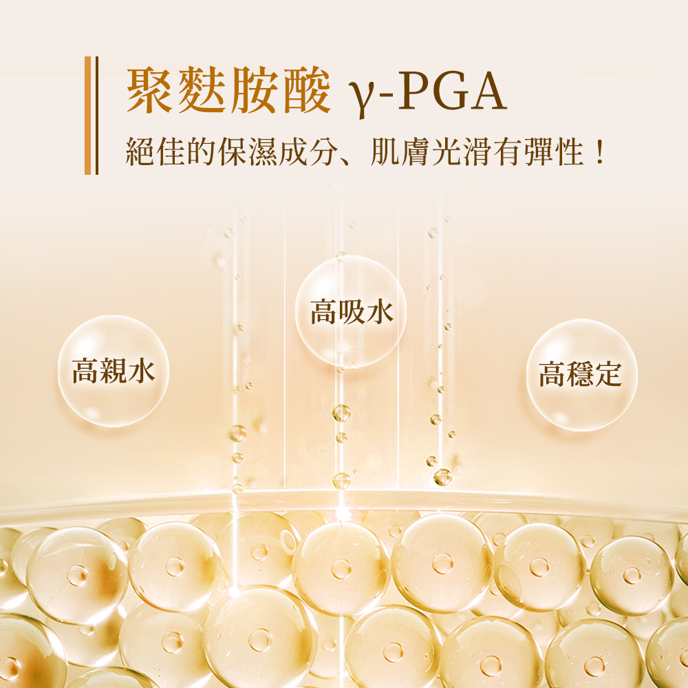 γ-PGA 俗稱為天然保濕因子其中一員,具有高度親水性吸水性,很穩定安全,是絕佳的保濕成分,能使肌膚光滑有彈性,並在肌膚外層形成薄薄的軟性保護膜,加強保濕,改善肌膚狀況。