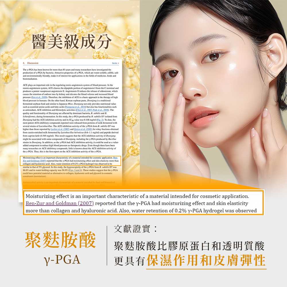 研究資料顯示,傳統玻尿酸每單位的聚水能力為1 : 500~600,水溶性玻尿酸則為1 : 900~1,000,而每單位γ-PGA 納豆萃取物的聚水能力為1 : 5,000,相當是水溶性玻尿酸的5倍、傳統玻尿酸的10倍!