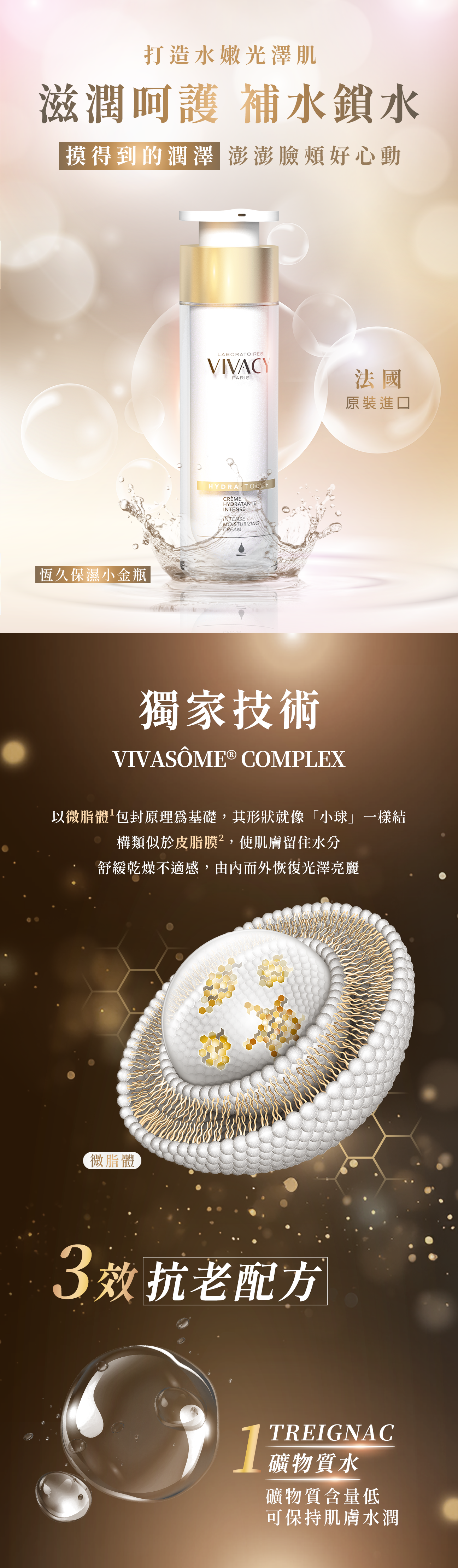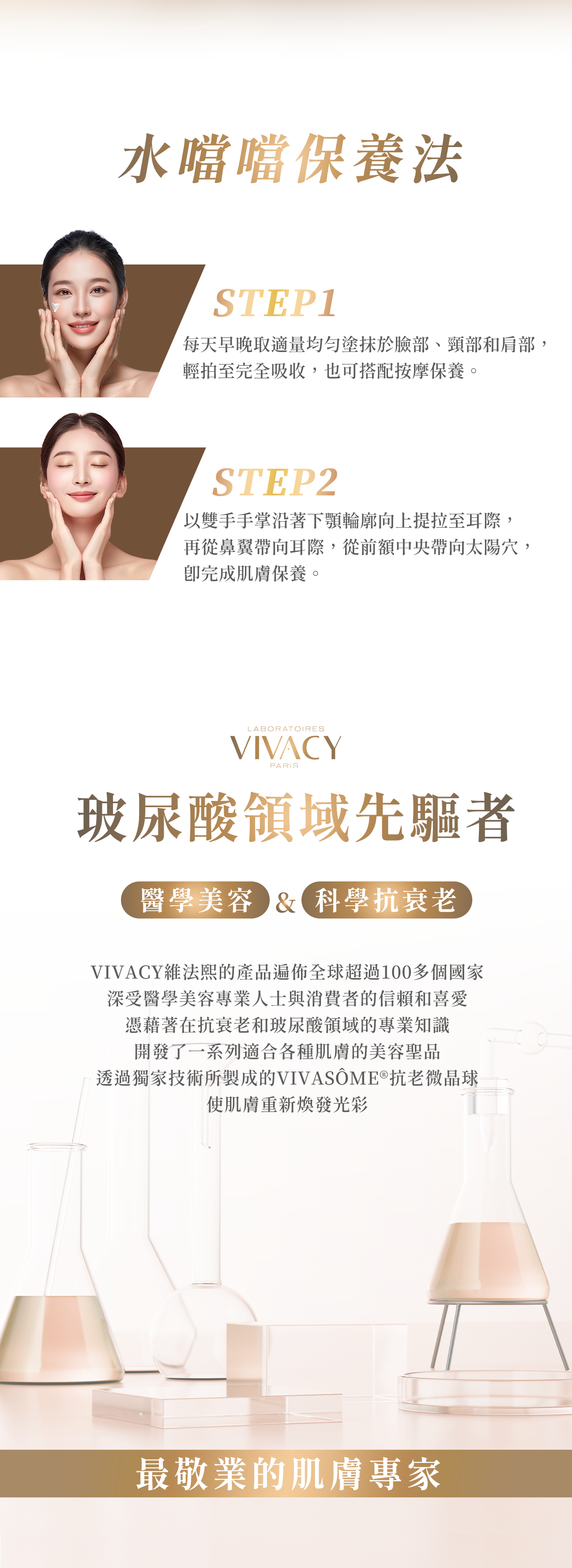 (1)VIVASÔME® complex + 玻尿酸 + 穩定型維生素C,深度補水鎖水,維持肌膚彈性。