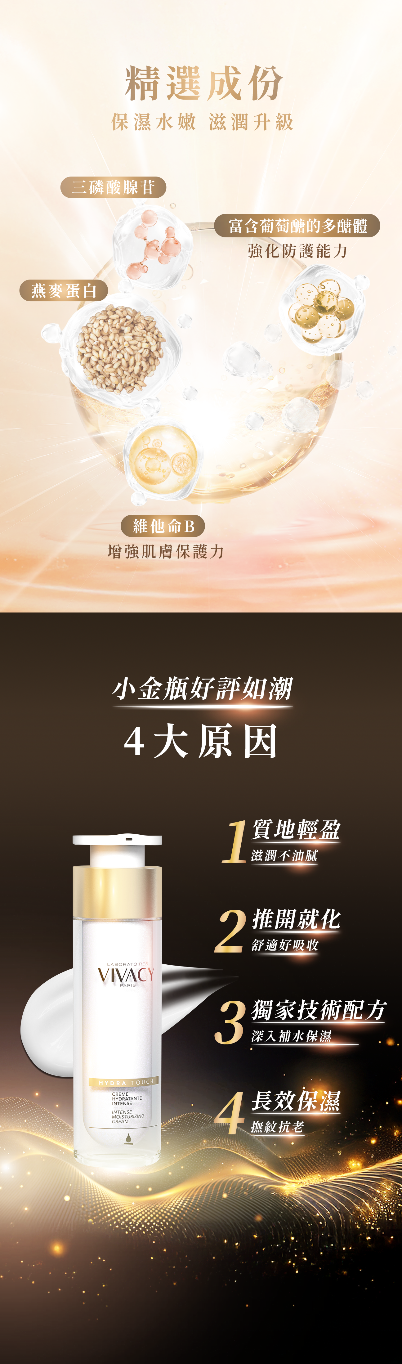 VIVACY維法熙 恆久保濕小金瓶,法國原裝進口,是一款非常滋潤肌膚的保濕乳液,同時又兼具清爽不黏膩的特性,適合乾燥肌膚或是欲加強補水肌膚的你!